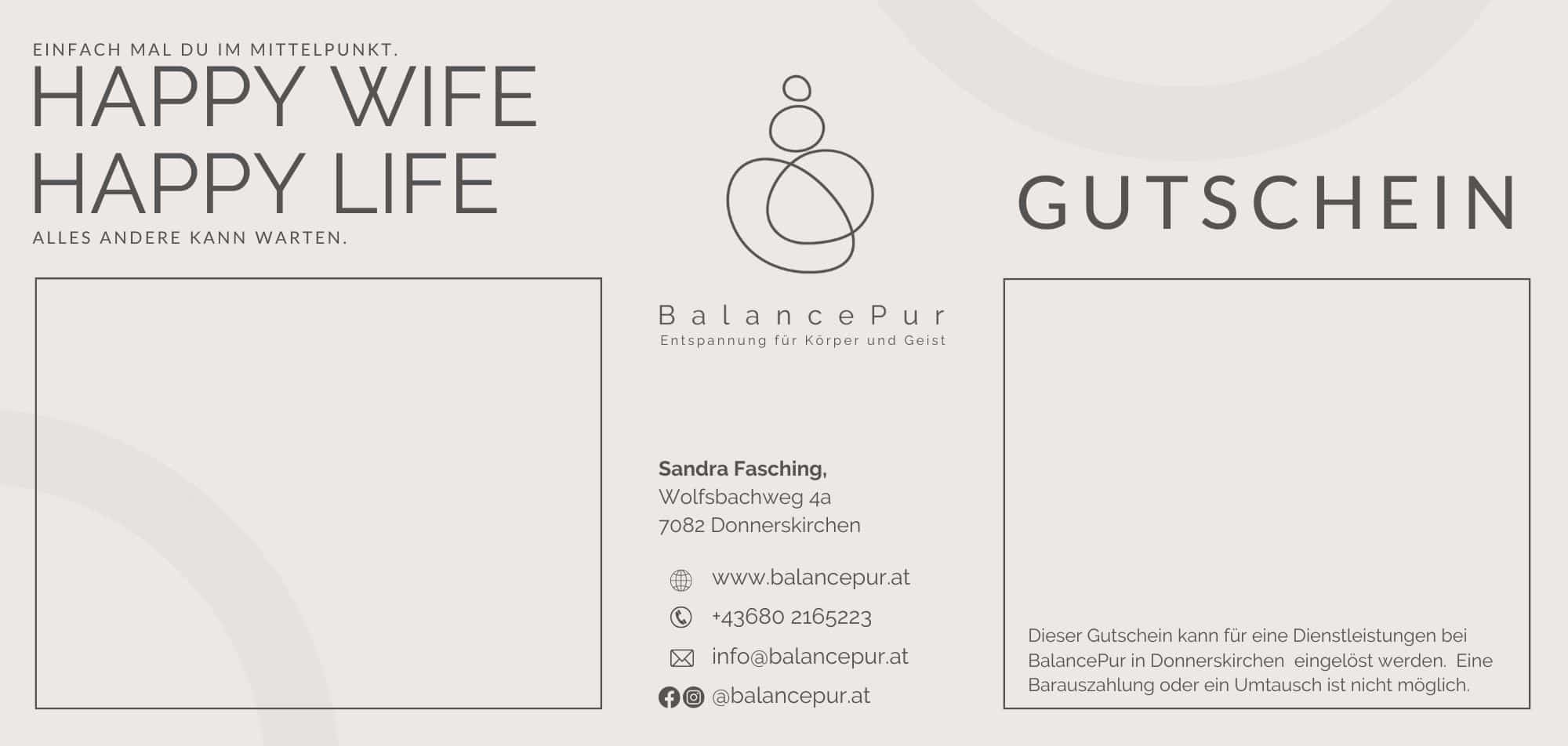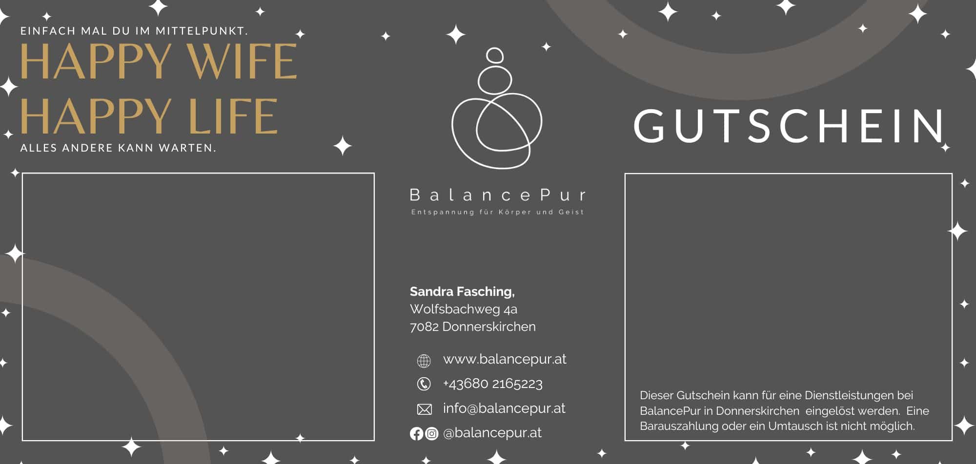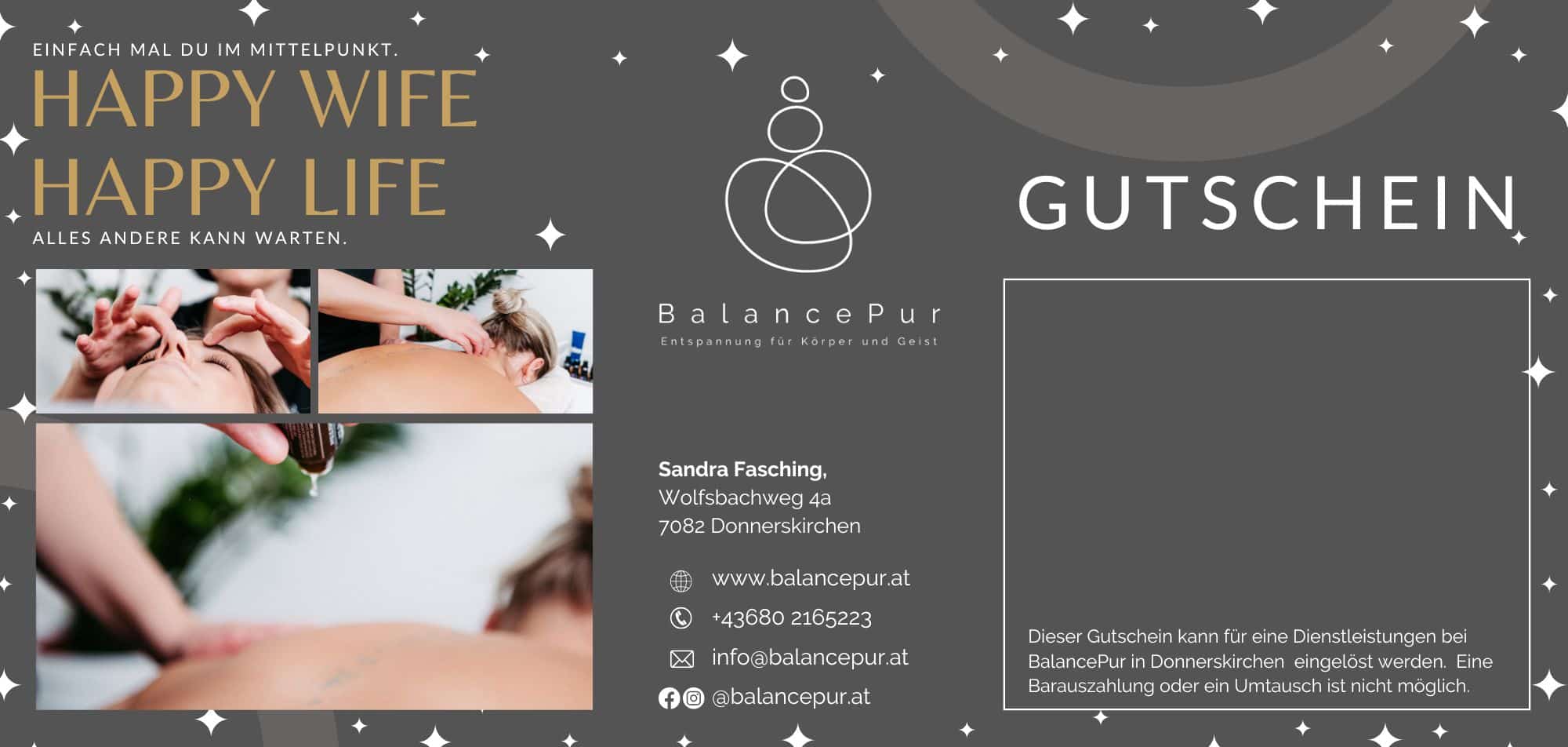 Mit dem „Happy wife – Happy life“ Gutschein schenkst du deiner Partnerin eine Auszeit bei BalancePur in Donnerskirchen – statt einem Geschenk, das in der Lade verschwindet.